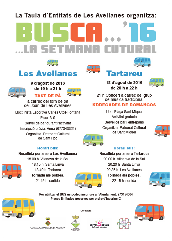 La Taula d'Entitats de les Avellanes organitza la seva primera activitat: BUSCA'16, una ruta en autobús que facilita el desplaçament de manera gratuïta pels pobles del municipi per participar en les activitats de les Setmanes Culturals de cada poble