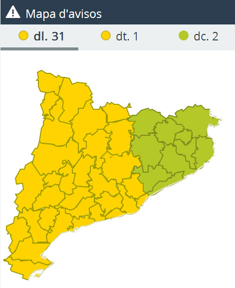 Protecció Civil posa en Prealerta el Pla INUNCAT per la previsió de pluges intenses a partir d'aquest vespre a l'oest de Catalunya.