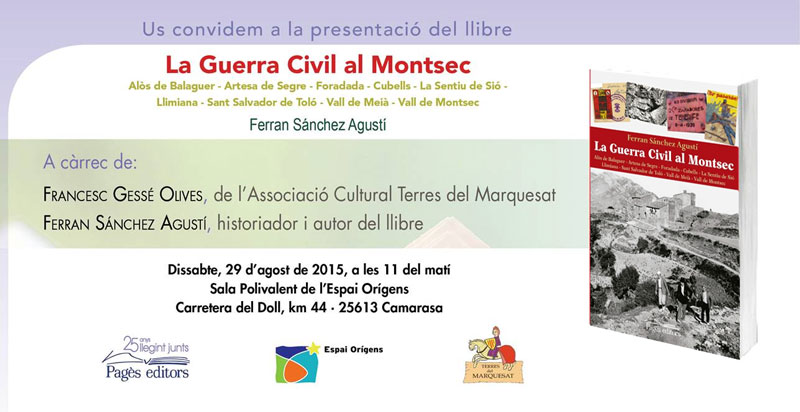 Aquest dissabte es realitzarà a les 11 del mati la Presentació del llibre 'La Guerra Civil al Montsec', a l'Espai Orígens de Camarasa, a càrrec de l'autor Ferran Sanchez Agustí, autor d'altres llibres de la mateixa temàtica.