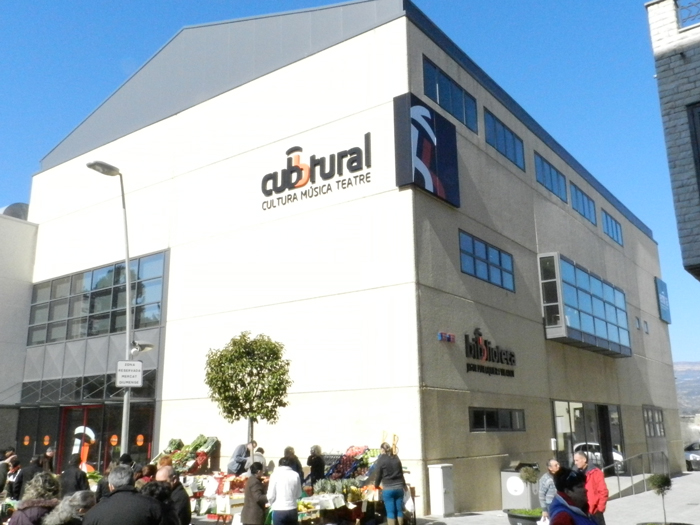 Col·loquen els cartells al Casal Cultural d'Artesa de Segre. L'edifici s'anomena Cubtural, un joc de paraules amb la forma de l'immoble i les seves funcions.