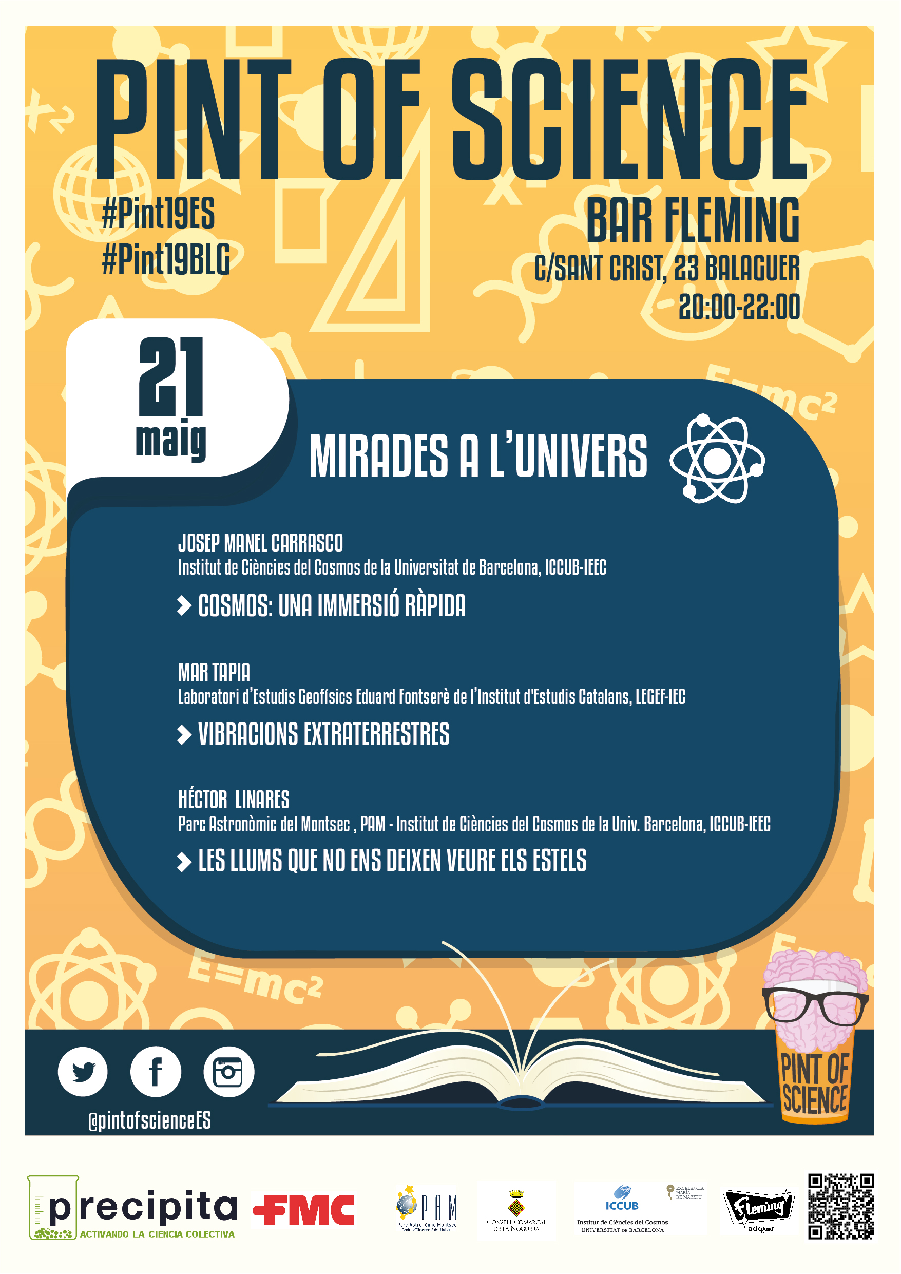 El festival Pint of Science aterra a Balaguer aquest dimarts amb les conferències 'Mirades de l'Univers'. Es farà de 8 a 10 del vespre al Bar Fleming i amb el PAM Montsec i l'Institut de Ciències del Cosmos de la UB.
