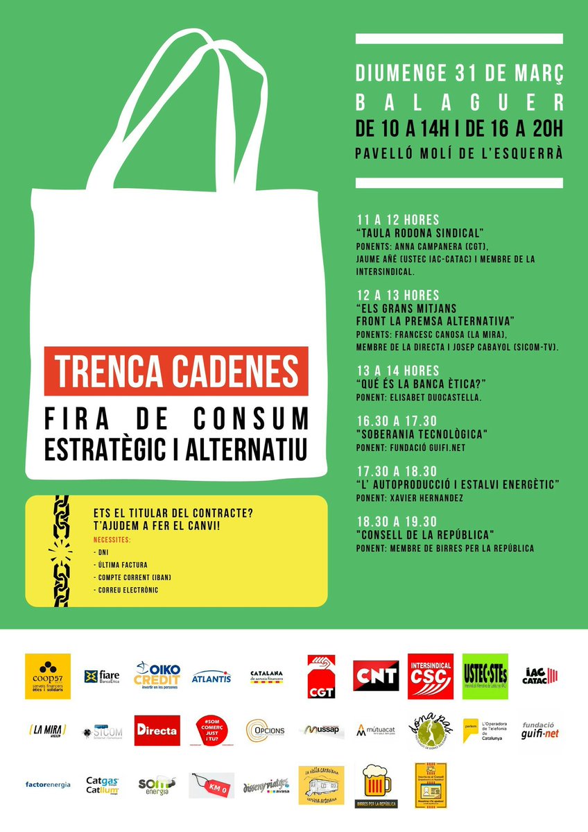 Aquest diumenge tindrà lloc a Balaguer la fira 'Trenquem Cadenes'. Una fira que vol servir per donar eines als visitants per trencar amb l'actual model econòmic amb un consum estratègic i alternatiu.