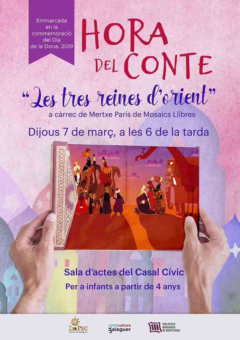 Demà dijous dia 7 de març, a les 6 de la tarda i a la sala d'actes del Casal Cívic tindrà lloc l'hora del conte per a infants a partir de 4 anys 'Les tres Reines d'Orient', a càrrec de Mertxe París, de Mosaics Llibres