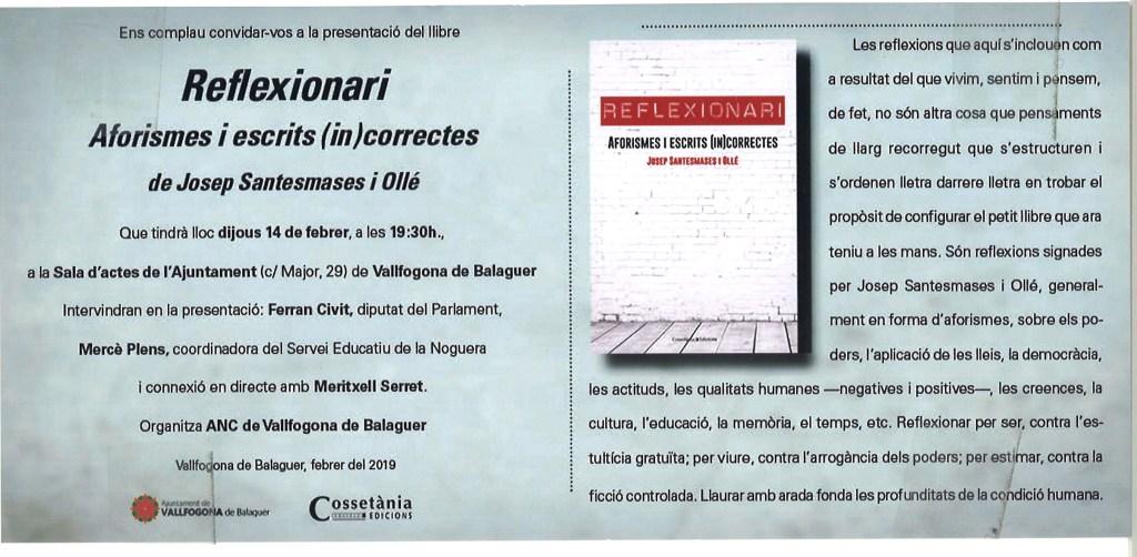Avui dijous 14 de febrer es presentarà a Vallfogona de Balaguer el llibre Reflexionari, Aforismes i escrits (in)correctes, de Josep Santesmasses i Ollé