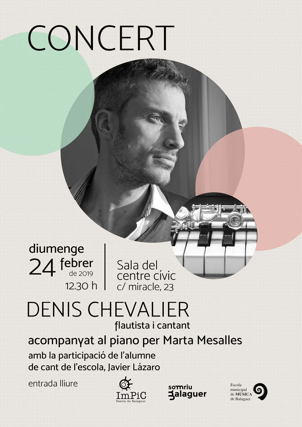 L'Escola de Música de Balaguer acollirà el diumenge dia 24 de febrer un concert de Denis Chevallier, acompanyat al piano per Marta Mesalles i el cantant Javier Lázaro