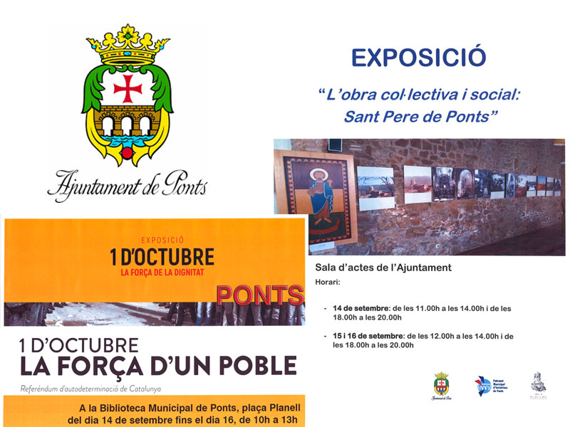 La biblioteca de Ponts acull aquest cap de setmana l'exposició 1 d'Octubre, la força de la dignitat. La sala d'actes del municipi acollirà també aquests dies la mostra 'L'obra col·lectiva i social: Sant Pere de Ponts'.
