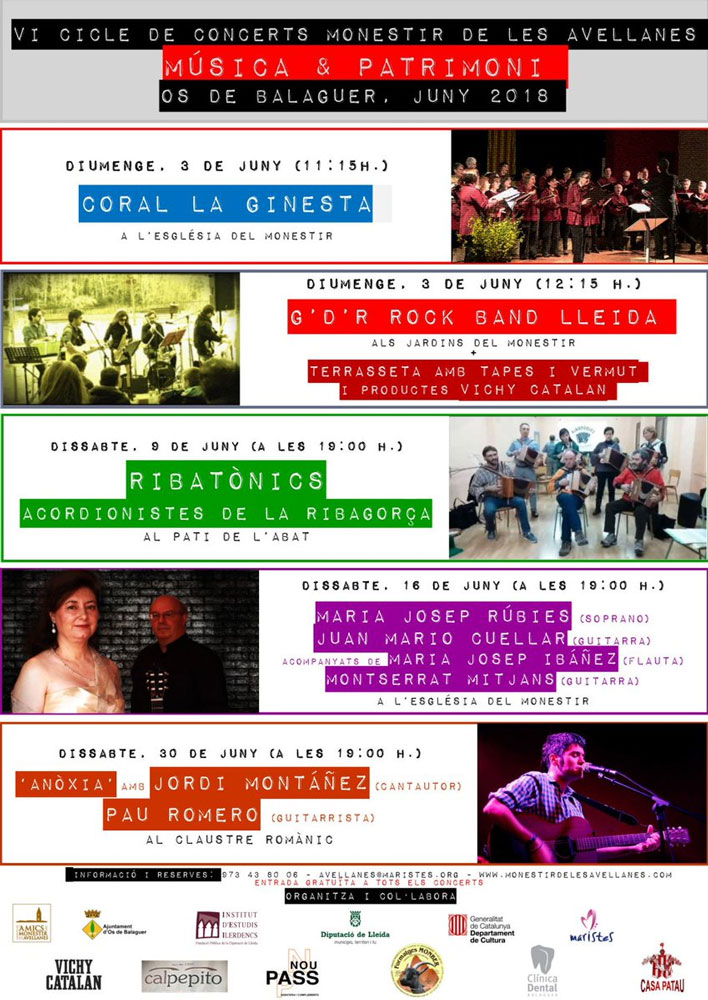 VI Cicle de Concerts Música & Patrimoni del Monestir de les Avellanes. Un any més, durant el mes juny, la música d'estils ben diversos sonarà als espais històrics del Monestir de les Avellanes.