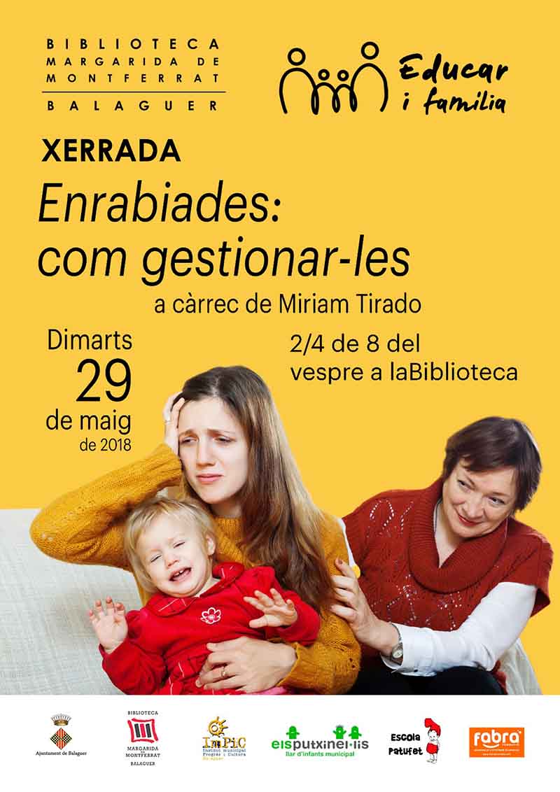 La Biblioteca Margarida de Montferrat ha programat per avui dimarts dia 29 de maig la Xerrada 'Enrabiades: com gestionar-les' a càrrec de Miriam Tirado, consultora de criança.