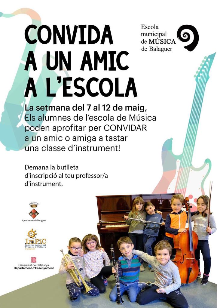 L'Escola de Música de Balaguer, amb l'objectiu d'incentivar les inscripcions i per donar a conèixer l'Escola, dóna l'oportunitat als seus alumnes de convidar un amic a tastar una classe d'instrument.