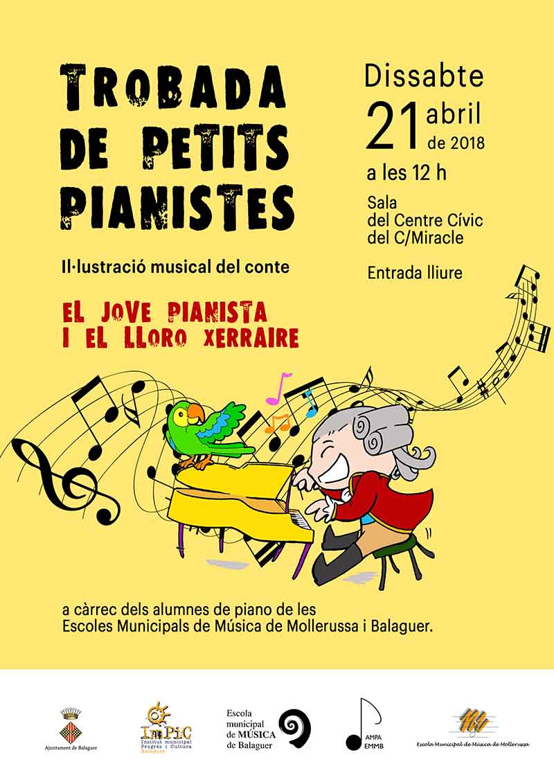 L'escola municipal de musica organitza el proper dissabte dia 21 una trobada de joves pianistes amb una audició del conte musicat. ''El jove pianista i el lloro xerraire '' .