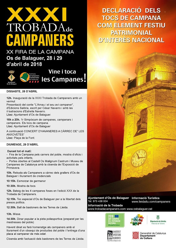 El proper diumenge 29 d'abril tindrà lloc una nova edició de la Trobada de Campaners a Os de Balaguer. Concretament serà la XXXI edició i coincidirà també amb la XX Fira de la Campana.