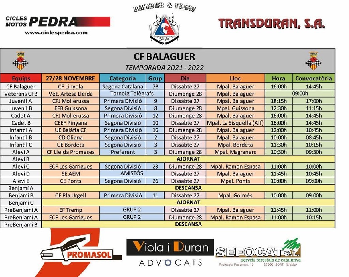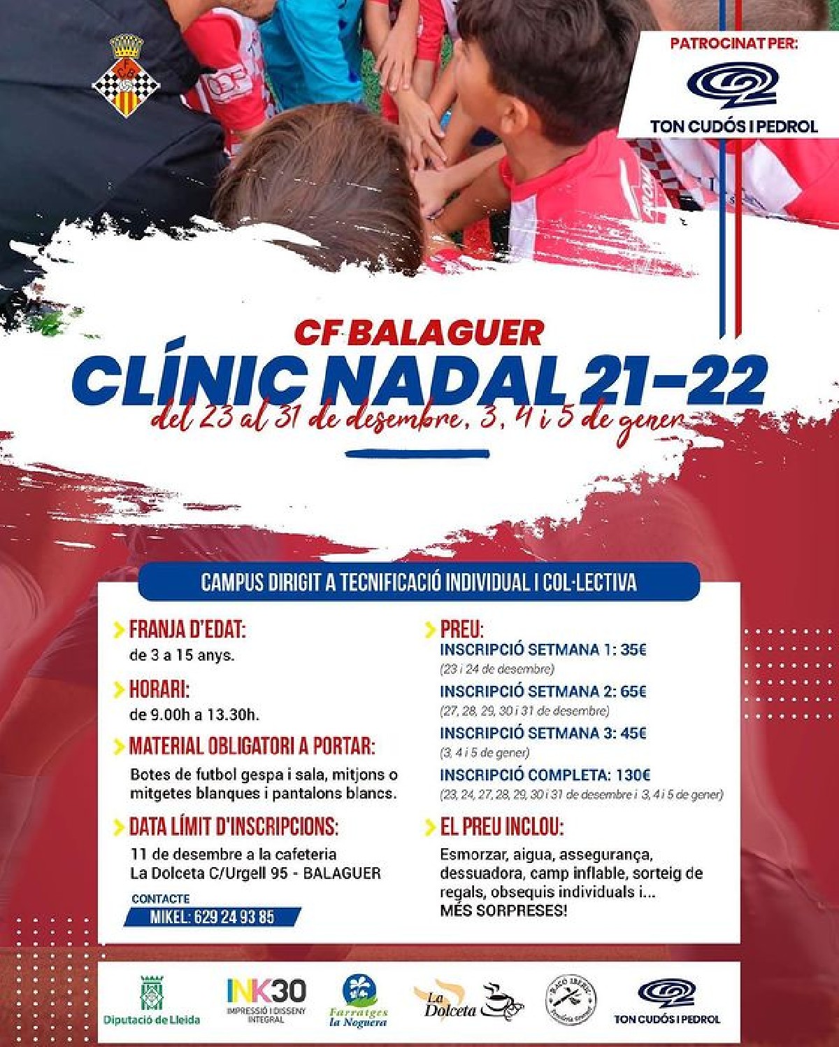 El Club Futbol Balaguer prepara el Clínic de Nadal, un campus dirigit al futbol femení i masculí, sense cap necessitat d'estar vinculat al club, que es realitzarà durant els dies de les vacances escolars. S'adreça a edats de 3 a 15 anys