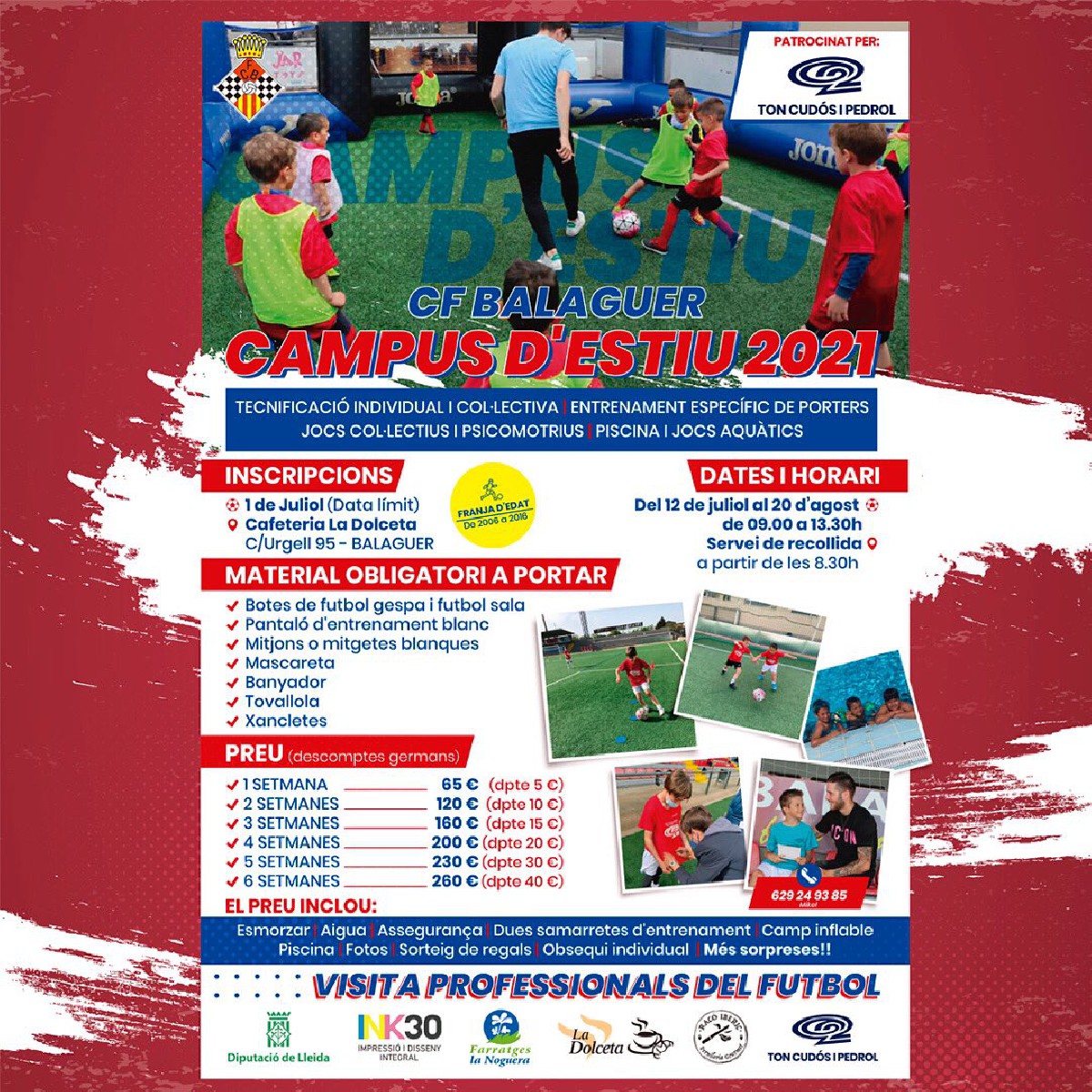 El Club Futbol Balaguer ultima els preparatius per al seu campus d'estiu. Es desenvoluparà del 12 de juliol al 20 d'agost als matins i s'adreça a infants nascuts entre els anys 2006 al 2016