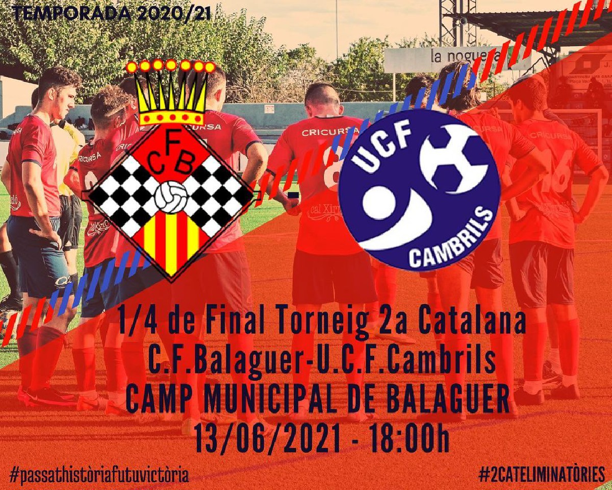 El primer equip del Club Futbol Balaguer juga aquest diumenge al municipal els quarts de final del Torneig de Segona Catalana contra el Cambrils. Si guanya es classificarà per passar a la semifinal. Passi o no, serà l'últim partit de la temporada a casa