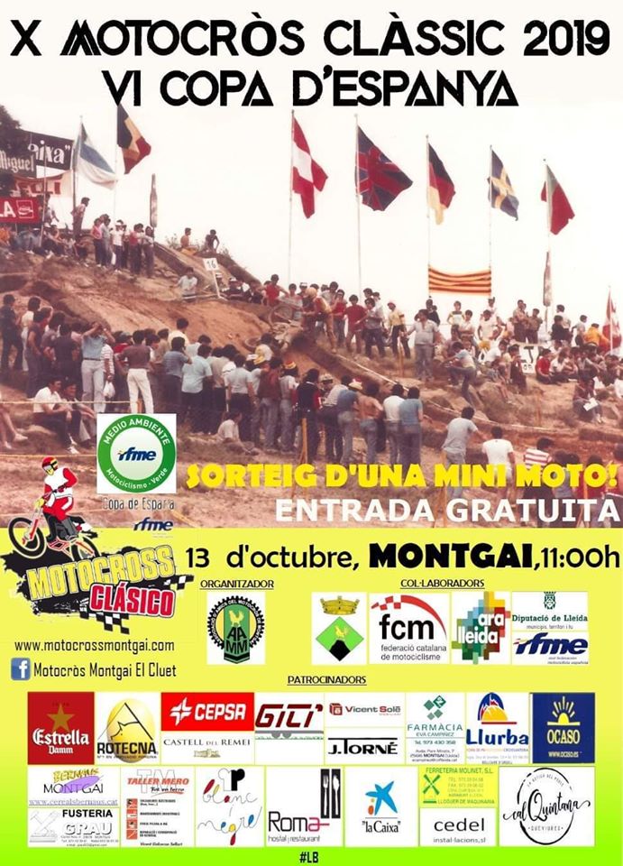 Montgai acull aquest diumenge al circuit del Cluet el 10è Motocros Clàssic 2019, 6a Copa d'Espanya. S'hi espera la participació dels millors pilots en cada categoria des de les 11 del matí, ja que a data d'avui ja són 89 els pilots inscrits.