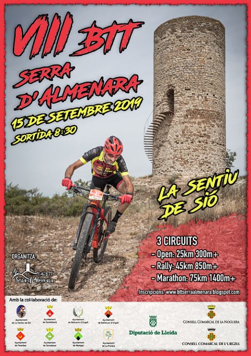 Aquest diumenge es celebrarà la BTT Serra d'Almenara, amb recorreguts de 25, 45 i 75 km. Sortirà del municipi de La Sentiu de Sió a 2/4 de 9 del matí i s'hi esperen uns 350 participants.