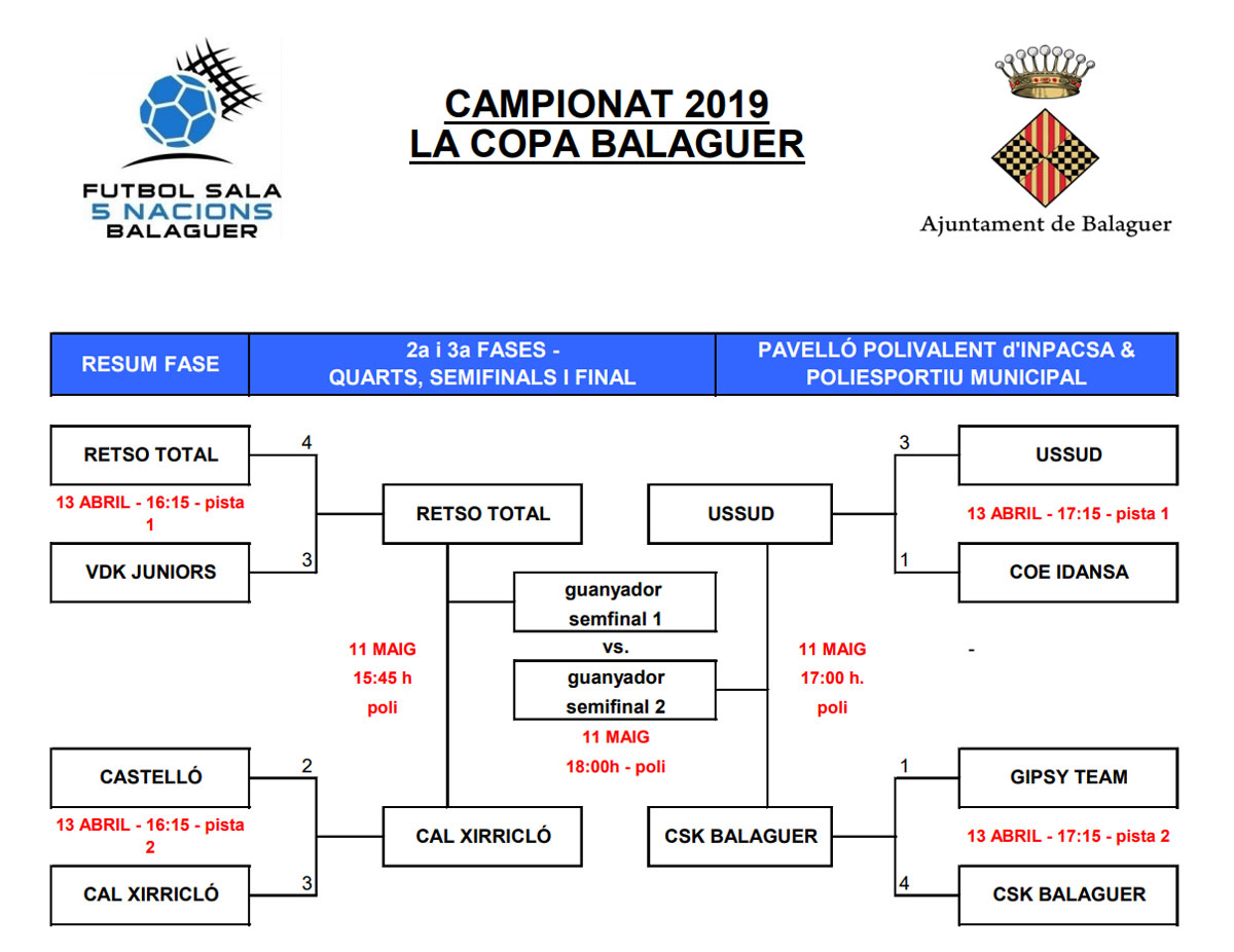 El pavelló 1r octubre de Balaguer acollirà aquest dissabte 11 de maig una nova edició del torneig de futbol sala 5 Nacions i final del torneig de la COPA BALAGUER