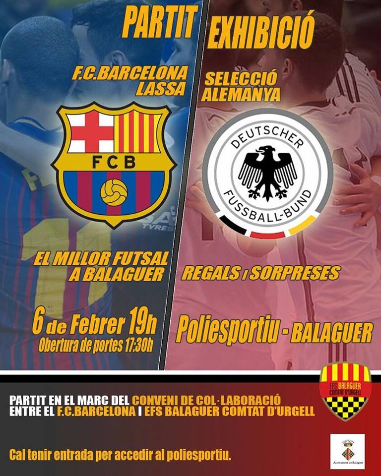 El poliesportiu municipal de Balaguer acollirà el proper dimarts un partit amistós entre el F.C. Barcelona Lassa i la selecció alemanya. Serà a partir de les 19h. L'entrada és gratuïta però l'aforament és limitat.
