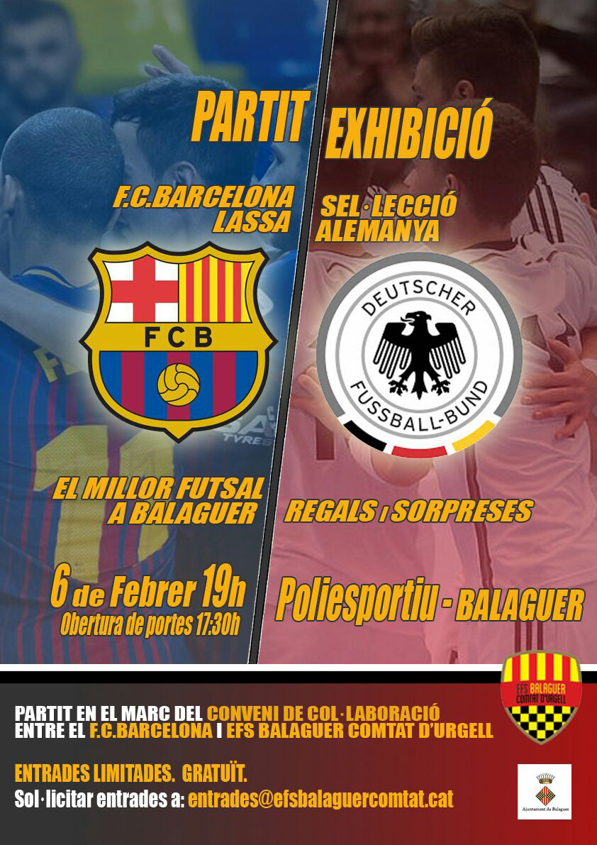 Exhaurides les entrades per veure avui el partit de futbol sala entre el F.C. Barcelona Lassa i la selecció alemanya. Des de l'organització, l'EFS Balaguer Comtat d'Urgell, demanen que aquells que no disposin d'entrada s'abstinguin d'anar al pavelló.