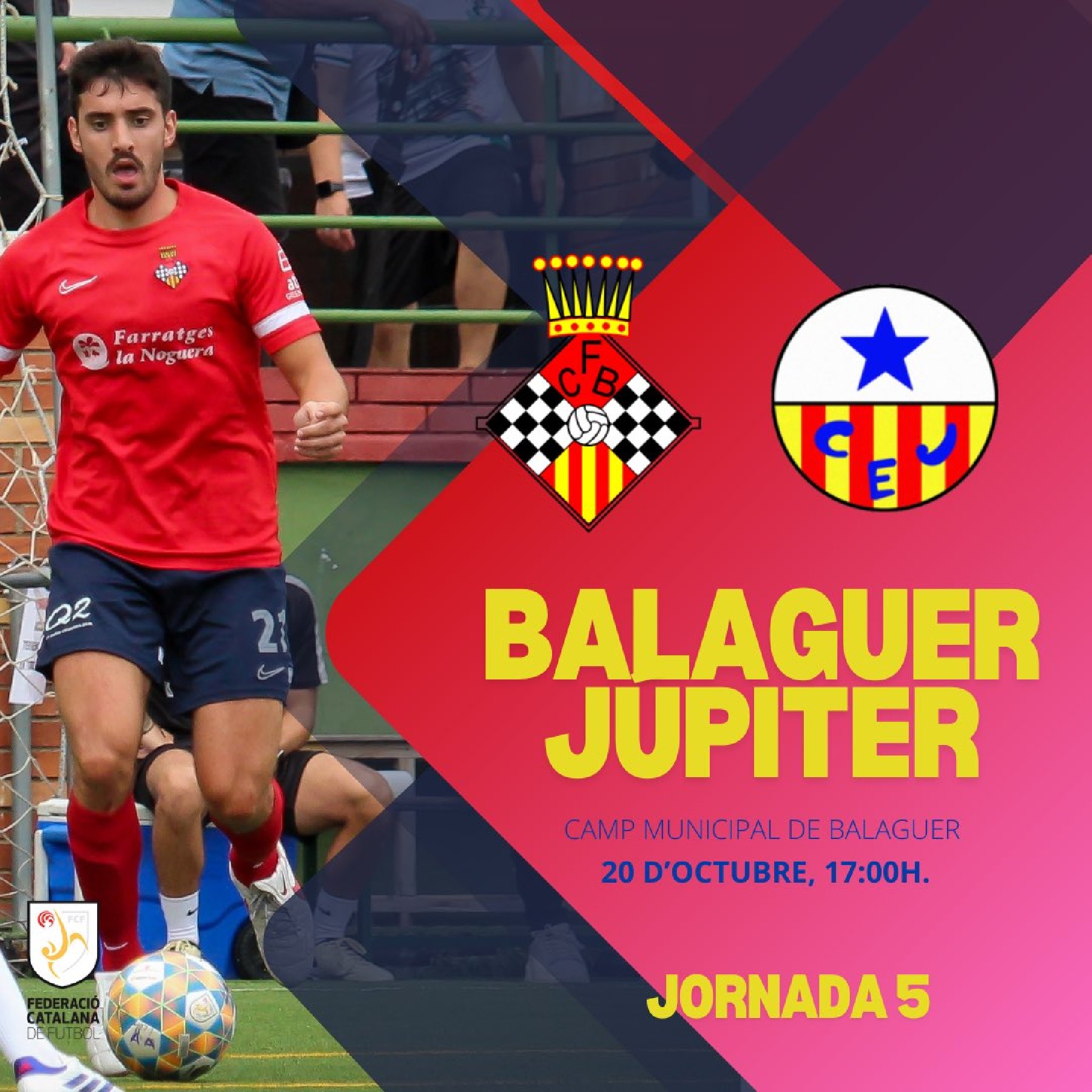 Cinquena jornada de Primera Catalana aquest diumenge al municipal de Balaguer. El primer equip del Club Futbol Balaguer rep la visita del Júpiter, actual líder invicte. El partit es jugarà a les 5 de la tarda