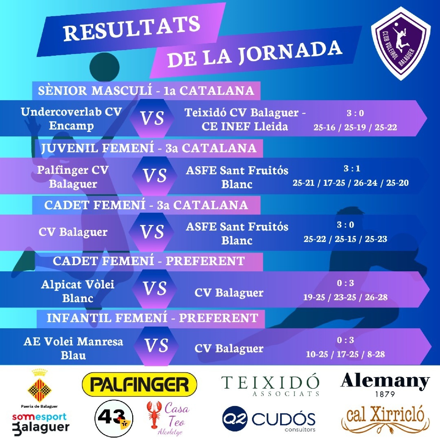 Ensopegada del Teixidó Associats del Club Voleibol Balaguer a Andorra, on va perdre aquest dissabte 3 a 0 contra l'Encamp. La resta d'equips van guanyar en les seves cites esportives