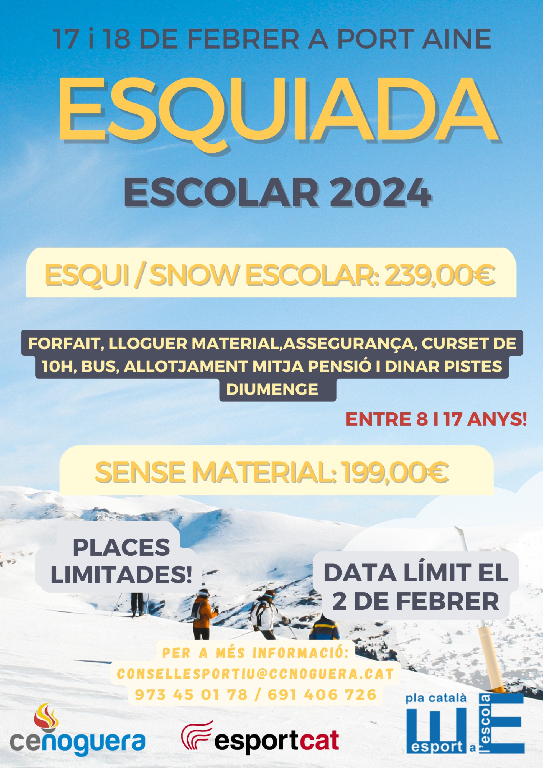 El Consell Esportiu de la Noguera obre les inscripcions per a l'Esquiada Escolar, que tindrà lloc els dies 17 i 18 de febrer a Port Ainé. S'adreça a infants i joves de 8 a 17 anys
