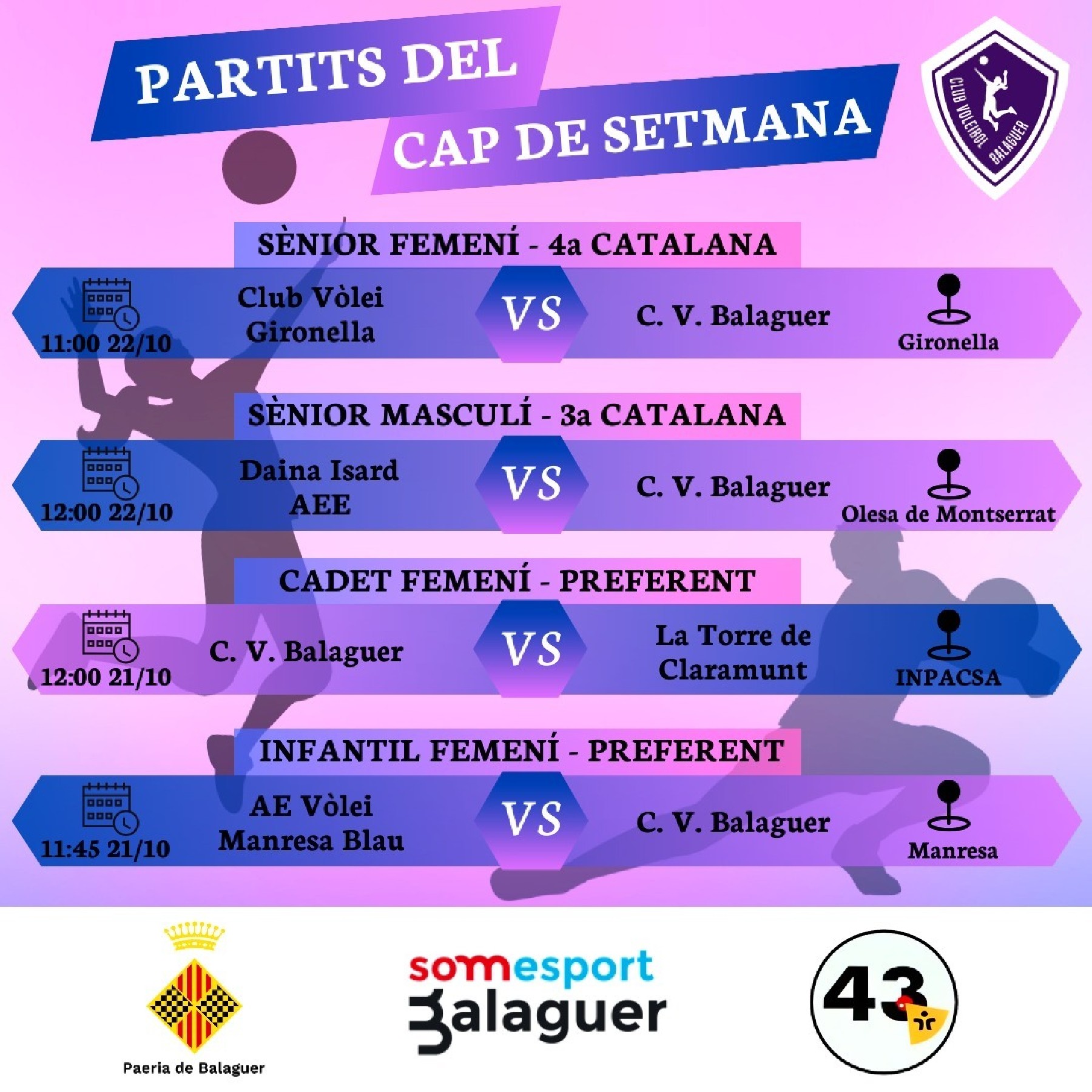 Els equips federats sènior del Club Voleibol Balaguer juguen aquest dissabte com a visitants. El femení de 4a Catalana a la pista del Gironella i el masculí de 3a Catalana a Olesa de Montserrat contra el Daina Isard