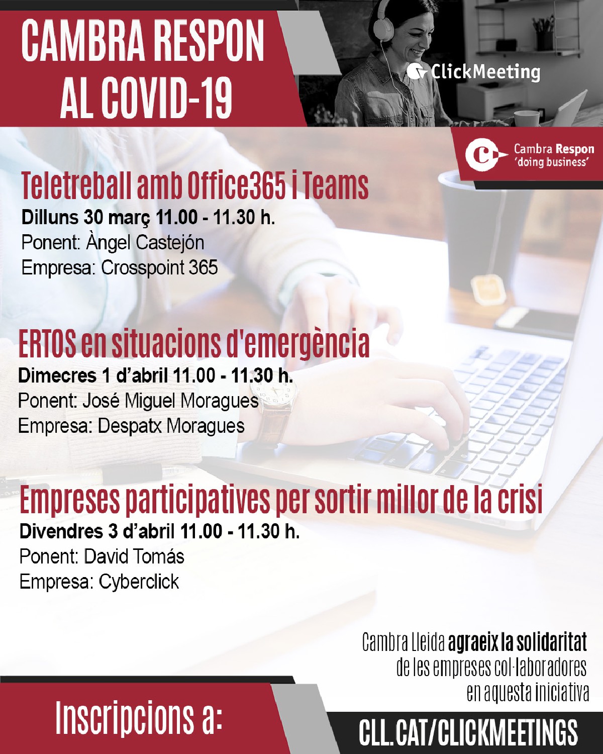 La Cambra de comerç de Lleida posa en marxa els Click Meeting, unes trobades virtuals adreçades a empreses per formar-se en teletreball o ERTOS entre altres.