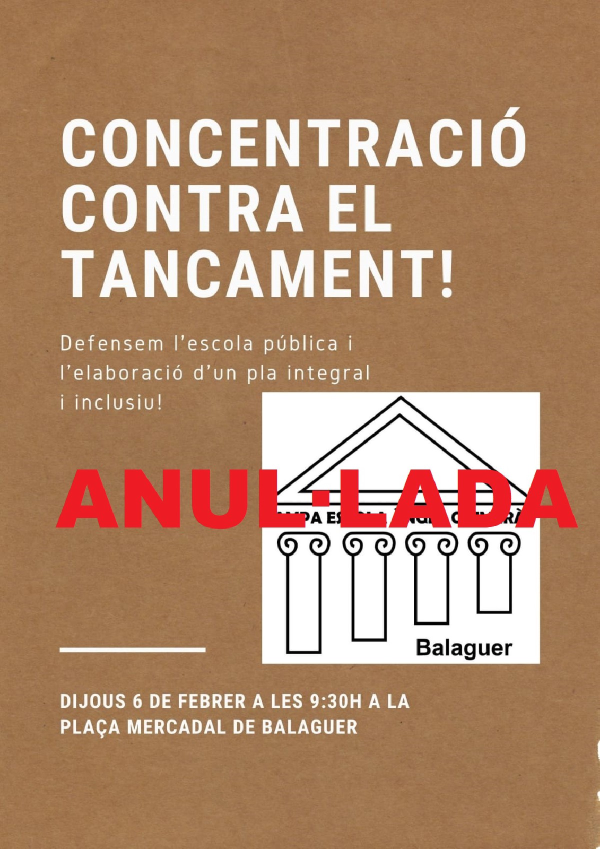 L'AMPA de l'escola Àngel Guimerà ha desconvocat la concentració prevista per aquest dijous a les 9.30 del matí a la Plaça del Mercadal, després del compromís d'Educació i Paeria de trobar una solució urgent que eviti el tancament.