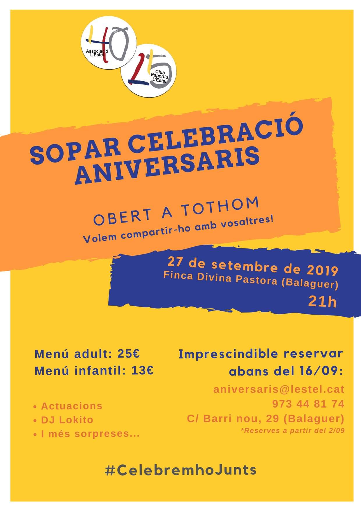 L'Associació l'Estel de Balaguer celebrarà un sopar en el marc dels actes d'aniversari. Es farà el divendres 27 de setembre a la Finca Divina Pastora de Balaguer.