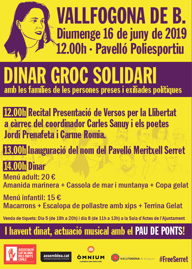 Vallfogona de Balaguer organitza el proper diumenge 16 de juny un Dinar Groc Solidari amb les famílies de les persones preses i exiliades polítiques. I la Inauguració del nom del Pavelló Meritxell Serret