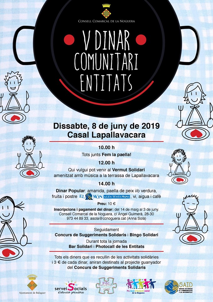 La Taula d'Entitats de Balaguer del PDC de la Noguera organitza el 5è Dinar Comunitari aquest proper dissabte dia 8 de juny a Lapallavacara