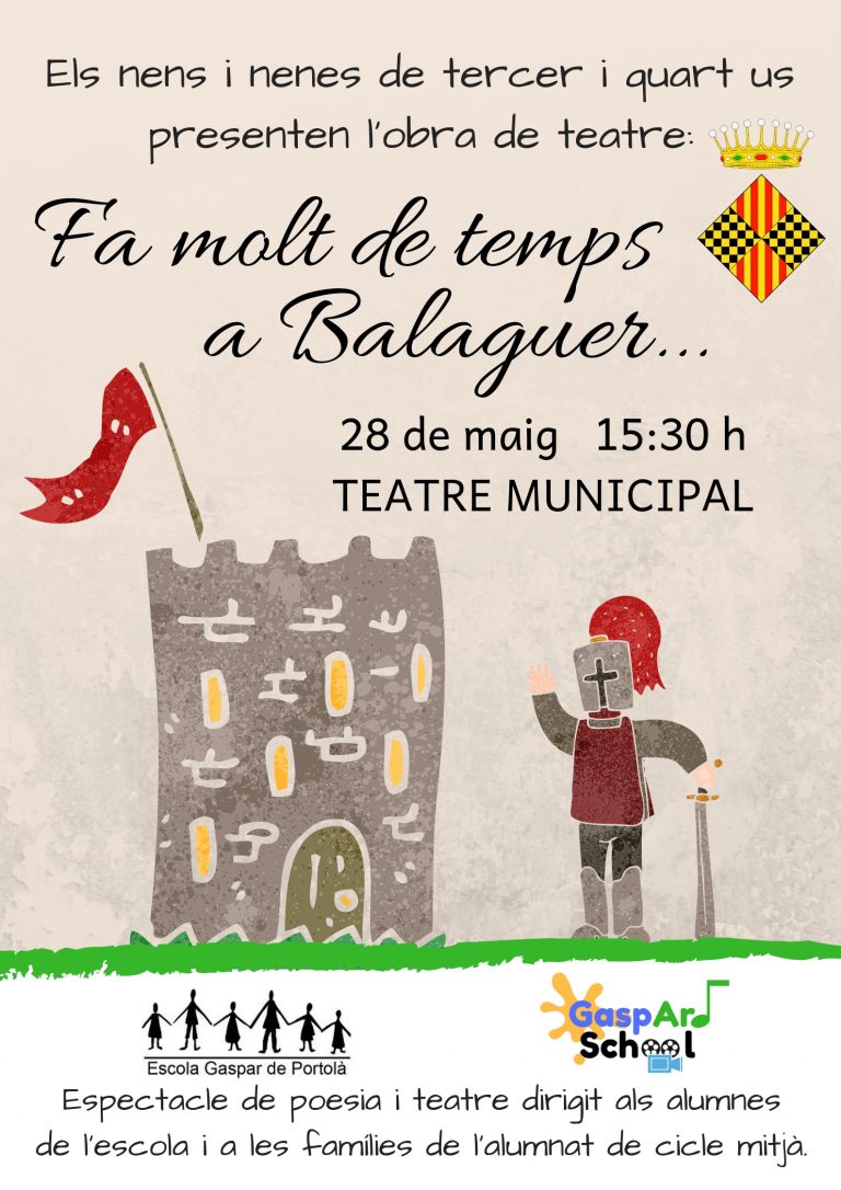 L'escola Gaspar de Portolà porta aquest dimarts 28 de maig l'espectacle 'Fa molt de temps a Balaguer' al Teatre Municipal. Es tracta d'una obra amb poesia i teatre adreçada a alumnes i pares de cicle mitjà