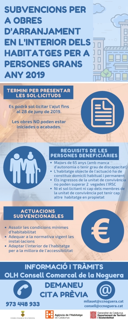 Oberta la convocatòria d'ajuts per a l'adequació d'habitatges de persones grans. El termini per presentar sol·licituds finalitza el dia 28 de juny de 2019