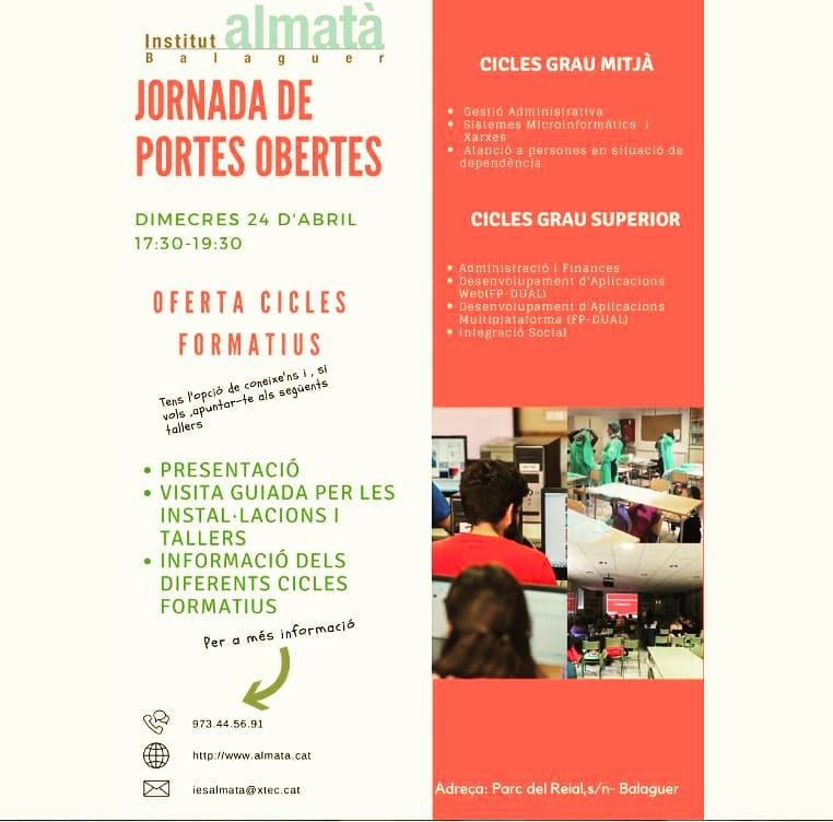 Aquest dimecres l'Institut Almatà celebrarà una jornada de portes obertes. Les llars d'infants municipals, el Patufet i els Putxinel·lis, la faran el pròxim dissabte 27 d'abril