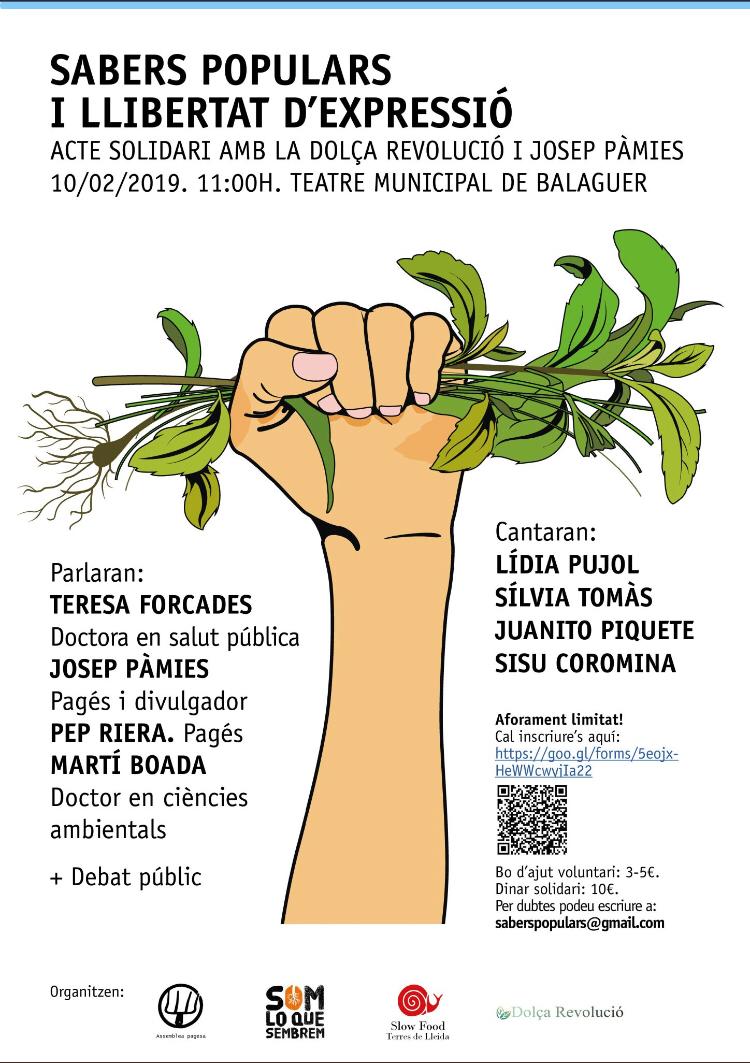 Diumenge tindrà lloc l'acte 'Sabers populars i llibertat d'expressió' a Balaguer. L'acte té una vessant solidària amb la Dolça Revolució i Josep Pàmies també és un acte en favor de la llibertat d'expressió