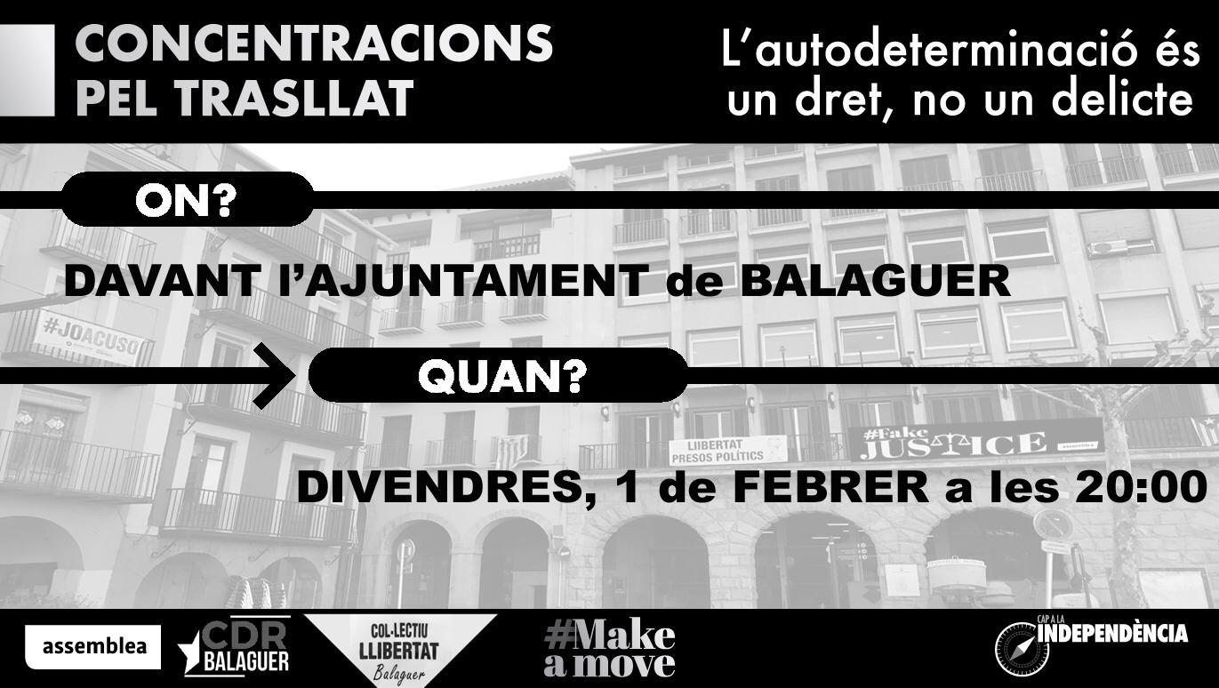 L'ANC Balaguer, el CDR Balaguer i el Col·lectiu Llibertat es sumen a les concentracions previstes en protesta pel trasllat dels presos polítics a Madrid. Demà divendres 1 de febrer a les 8 del vespre a la Plaça Mercadal