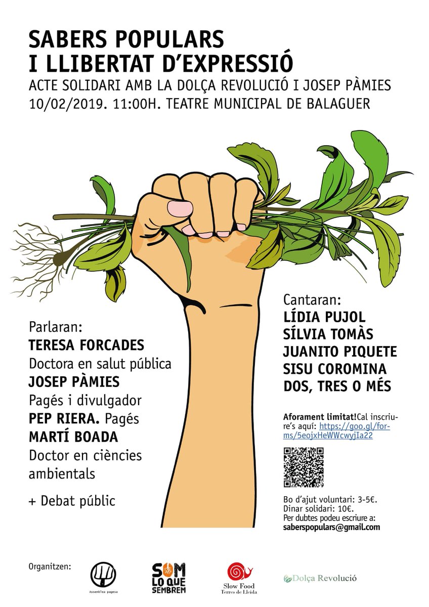 El diumenge 10 de febrer tindrà lloc l'acte Sabers populars i llibertat d'expresió a Balaguer. Hi parlaran Teresa Forcades, Josep Pàmies, Pep Riera i Martí Boada i hi cantaran noms com Lídia Pujol o Sílvia Tomàs