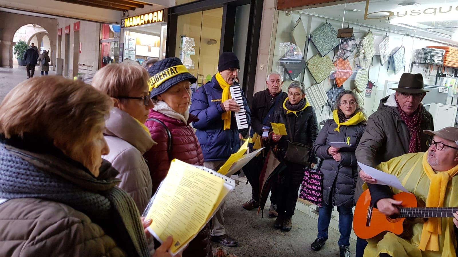 Avui s'ha reunit novament el Col·lectiu Llibertat de Balaguer, que tot i la pluja, ha portat les seves reivindicacions als porxos del carrer d'Avall i ha comentat les paraules que els ha adreçat el President Puigdemont des de Waterloo
