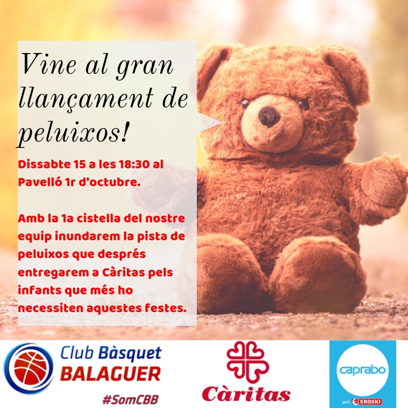 El Club Basquet Balaguer convida a tothom a fer un llançament de peluixos en el proper partit. Els peluixos recollits es destinaran a Càritas.