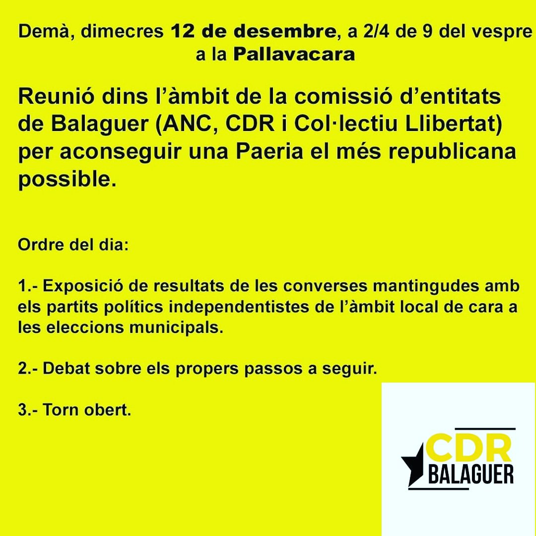 Les entitats sobiranistes de Balaguer organitzen demà dimecres 12 de desembre una reunió per valorar les opcions d'aconseguir una Paeria el més republicana possible, després de les converses amb els diferents partits