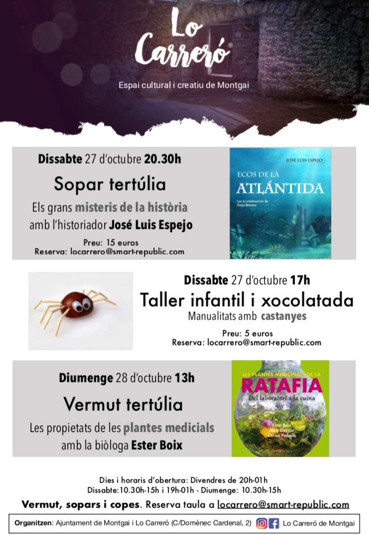 Lo Carreró de Montgai ha programat un taller infantil i dues tertúlies sobre els grans misteris de la història i sobre plantes medicinals per aquest cap se setmana. A més, el dissabte torna el mercat de les puces