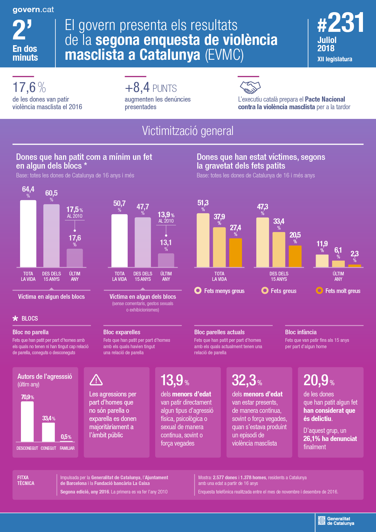 El Govern presenta els resultats de la segona Enquesta de Violència Masclista a Catalunya. El treball mostra que el 17,6% de les dones han patit violència masclista en el darrer any