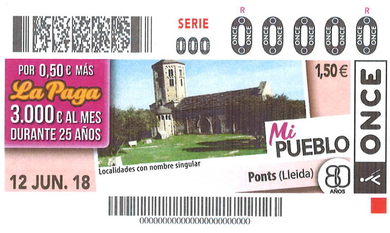 L'ONCE dedica el seu cupó del proper 12 de juny a Ponts, dins la sèrie ''El meu poble'', dedicada a localitats amb nom singular.