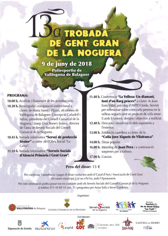 300 persones dels diferents casals d'avis de la comarca participaran demà a Vallfogona de Balaguer en la 13a Trobada de la Gent Gran de la Noguera.