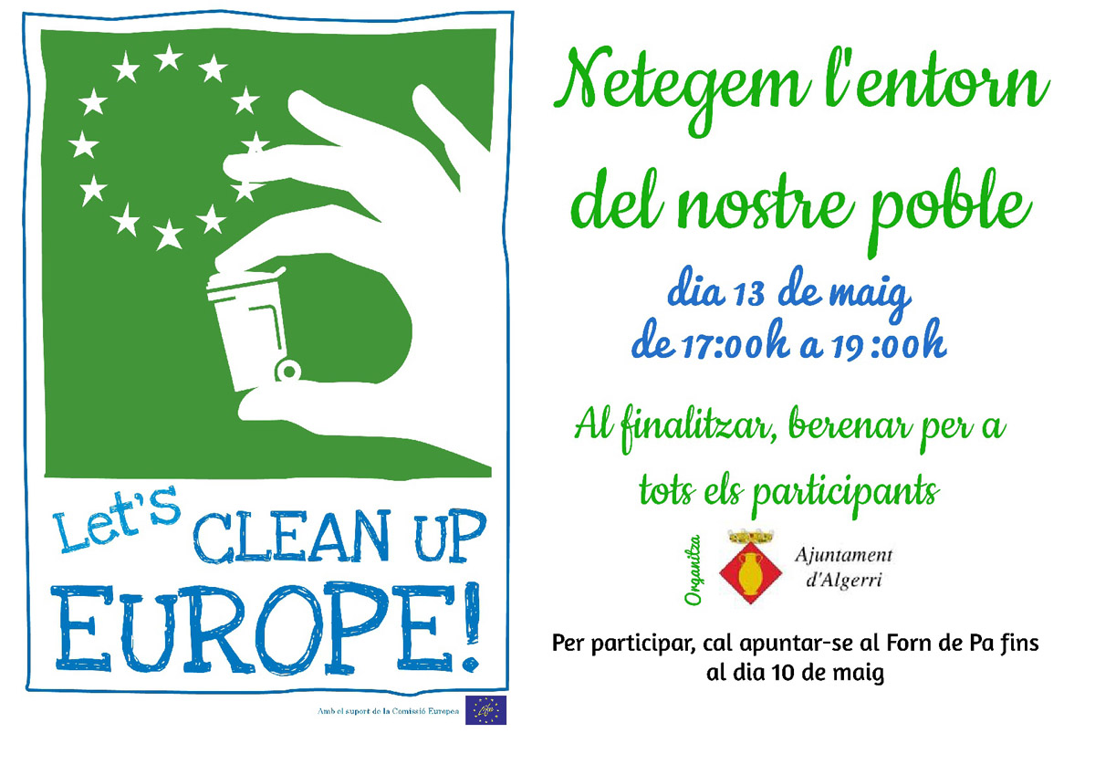260 accions de neteja dels espais naturals catalans se sumen a la iniciativa europea ''Let's Clean Up Europe!'. A la Noguera, una d'aquestes accions es durà a terme a l'Escola Salvador Espriu de Vallfogona de Balaguer i i una altra al municipi d'Algerri.