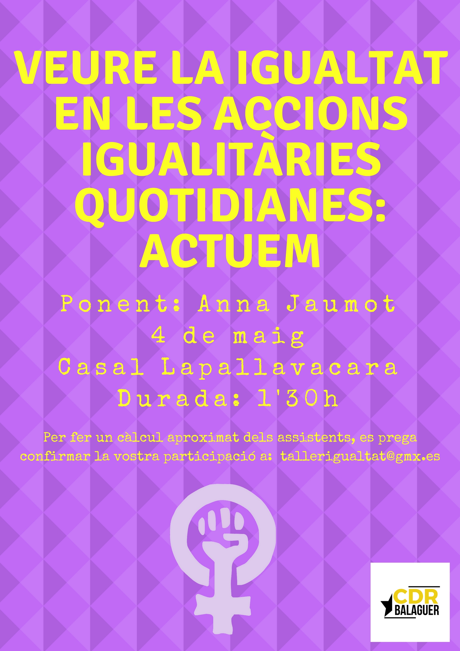 El CDR de Balaguer organitza un taller per tractar la igualtat de gènere i, contribuir en les relacions igualitàries del poder democràtic, en la construcció de la República.