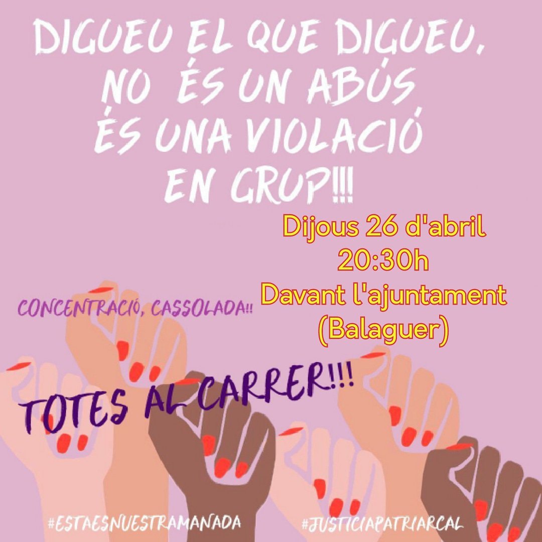 El CDR de Balaguer convoca una concentració-cassolada en protesta per la sentència a només 9 anys de presó pels membres de La Manada. Serà avui, a les 20.30 davant l'ajuntament de Balaguer.