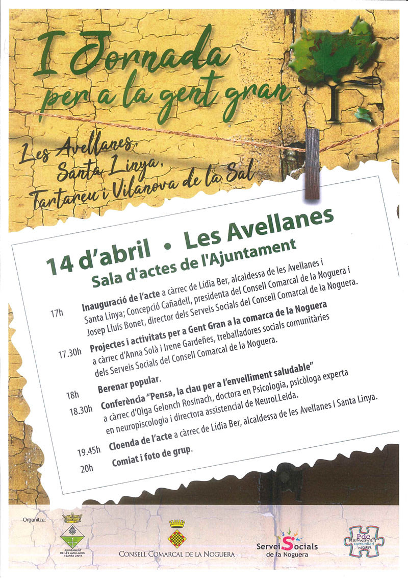 Dissabte 14 d'abril tindrà lloc la I Jornada de la Gent Gran. Es tracta d'una trobada per explicar projectes i activitats adreçades a la gent gran i que tindrà lloc al municipi de Les Avellanes.