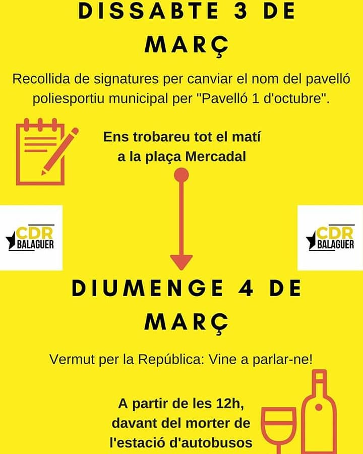 El CDR de Balaguer iniciarà aquest cap de setmana la campanya de recollida de signatures per canviar el nom del poliesportiu municipal per 'Pavelló 1 d'octubre'. Dissabte hi haurà parada al mercat i diumenge un vermut per la república.